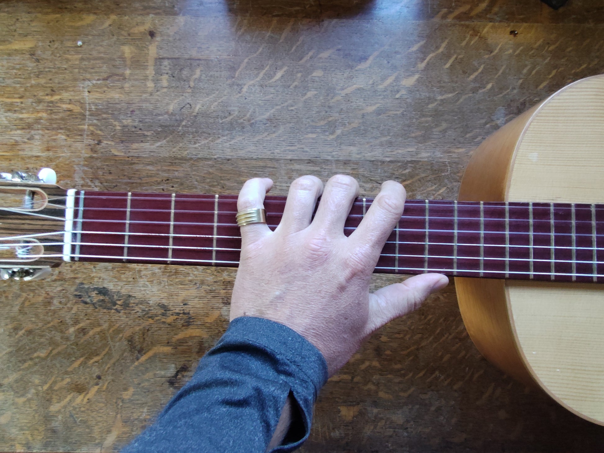 Fingers hurt from playing guitar? Build up your finger tip calluses with the Finger Tender Ring, so you can play the guitar longer! It is a 100% Brass ring with the texture of 3 actual guitar strings on it. This lets you build calluses throughout the day by pressing the tips of your cord-hand fingers on it just like you would on your guitar. The more you use it, the faster you will build up strong calluses that let you play guitar all day. Make sure to measure the diameter of the finger you want to wear the ring on and choose your size before purchasing. Enjoy!